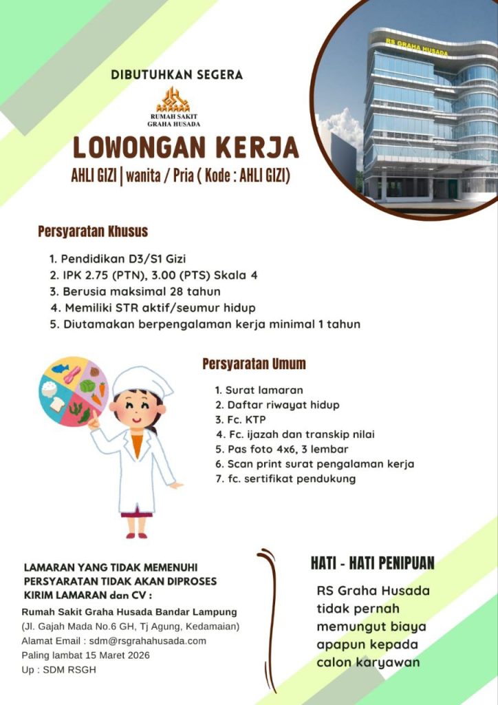 Rumah Sakit Graha Husada Bandar Lampung saat ini membuka kesempatan berkarir bagi tenaga profesional untuk bergabung bersama kami pada posisi Ahli Gizi. Lowongan ini terbuka untuk wanita maupun pria yang memiliki kompetensi dan dedikasi tinggi dalam bidang pelayanan kesehatan.